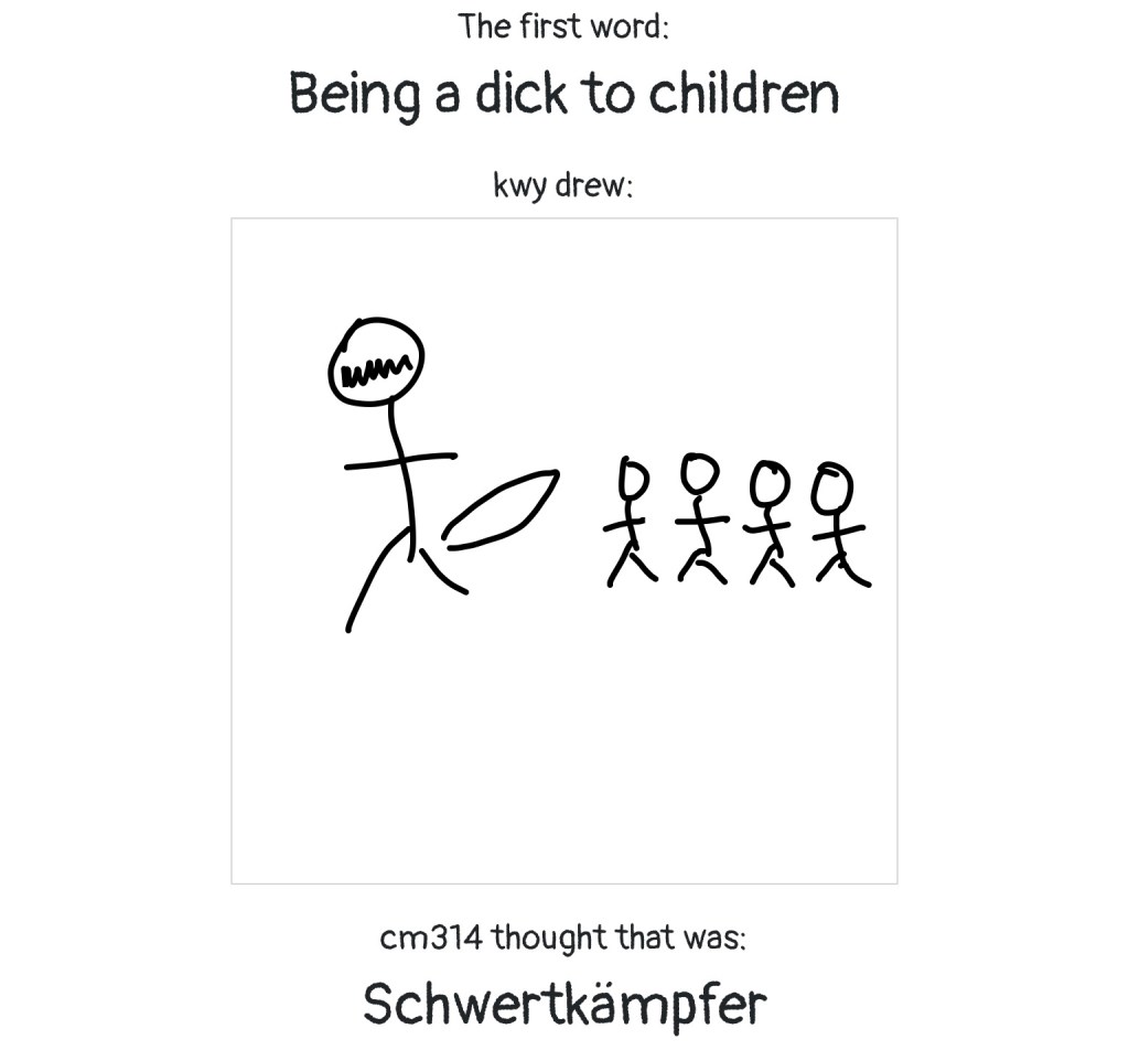 i tried to draw a moustache on the dick guy and the other stickmen are smaller cos they’re children. cm314 thought that was a swordsman…okay…
