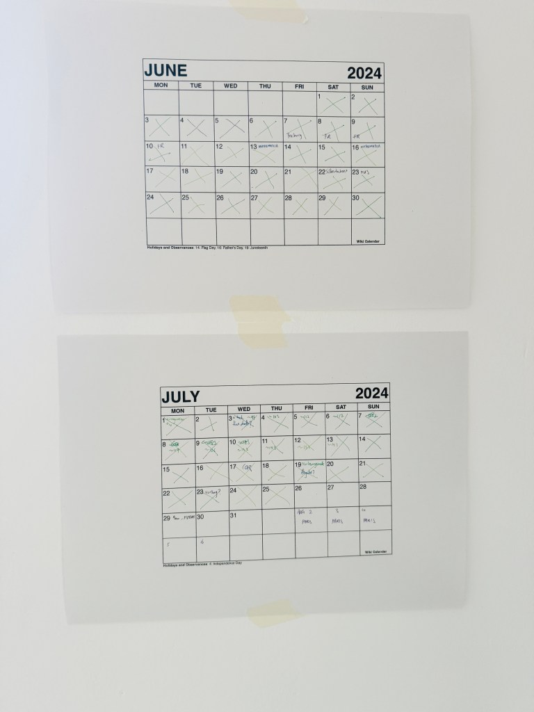 beside my desk there are the printed months of June and July 2024, as i had to work towards several deadlines up to the end of July. “the crazy eight weeks,” as i described it. the plan was to be absolved from them, before being able to thoroughly enjoy the short Olympics getaway. i have a habit of crossing out days, but sometimes i forget to do it.