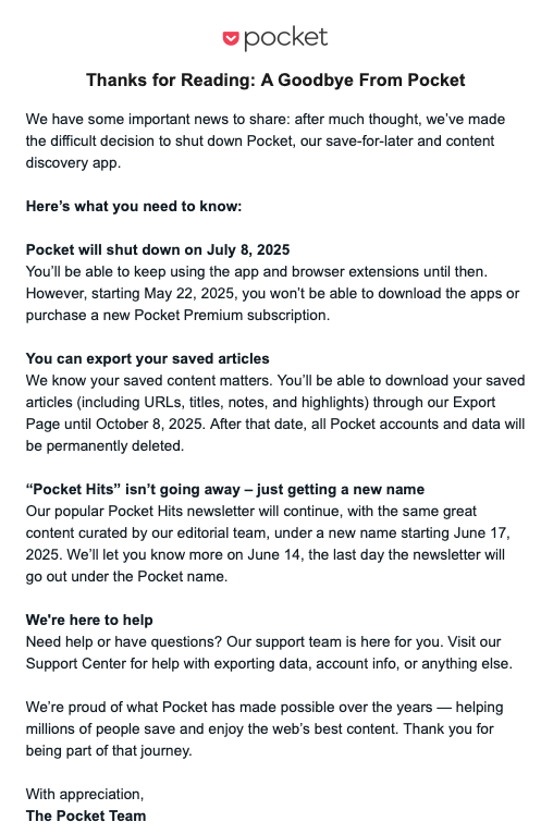 a service that i’ve been using for over a decade is shutting down. although, honestly i haven’t been using it much in the past few years. however, in the first few years, i was always on the top 10% or sometimes top 5% reader list at the year-end review (yeah Pocket was cool before Spotify). but i must admit… i think i was more like a top “article-saver” than anything… according to my exported lists, i’ve amassed almost 20k (19,874) articles; most of which i have not read. i saved them because i did not have the time to digest the texts… and now i don’t even have the time to save articles. lol.
